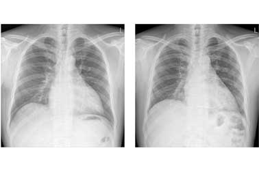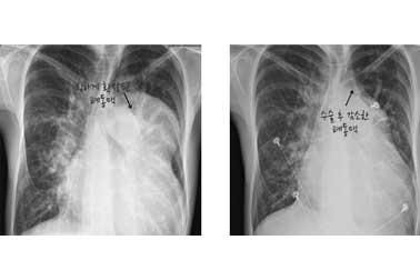 수술 후(우측) 흉부X선 사진 비교수술 후 심장의 크기가 감소하고 있습니다.